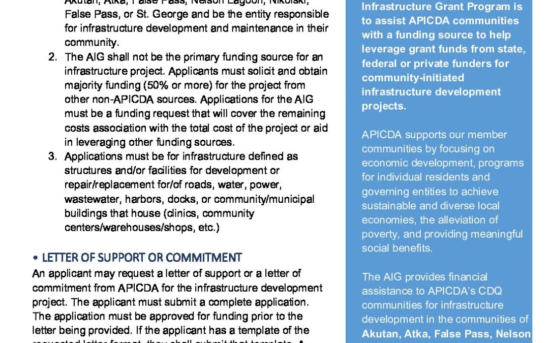 APICDA is a non-profit dedicated to strengthening local fisheries-based economies through increasing direct fisheries participation in the Bering Sea and Aleutian Islands, building support infrastructure and offering programs to assist the advancement of priority initiatives in its six member communities in the Aleutian-Pribilof region of Alaska.